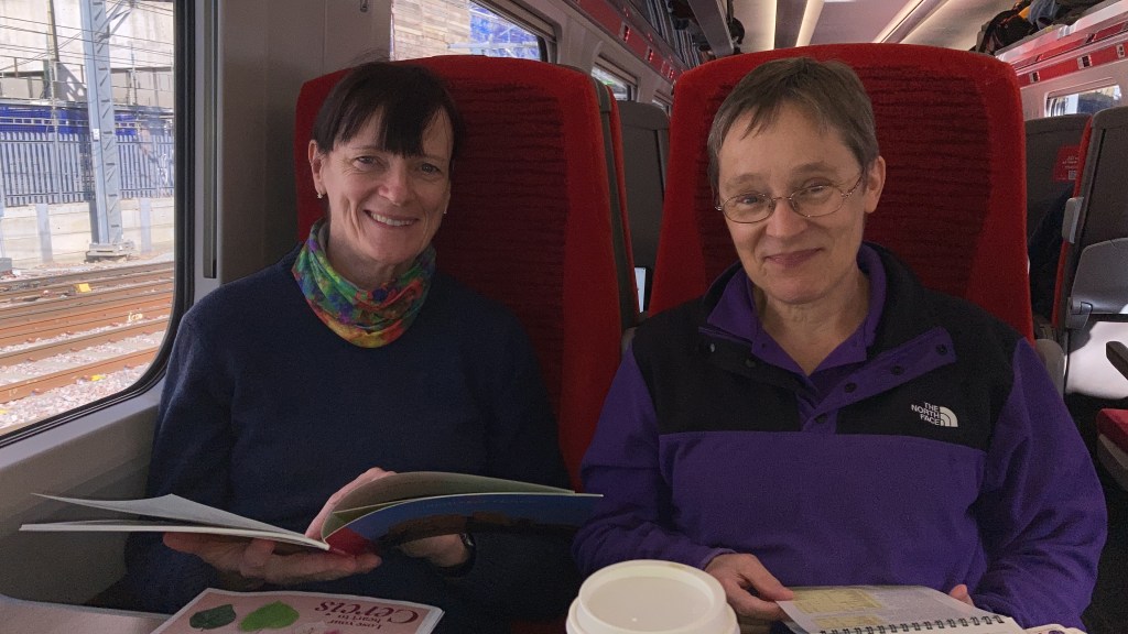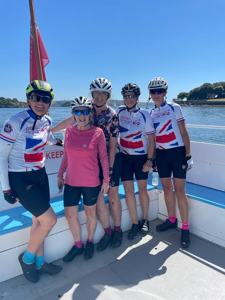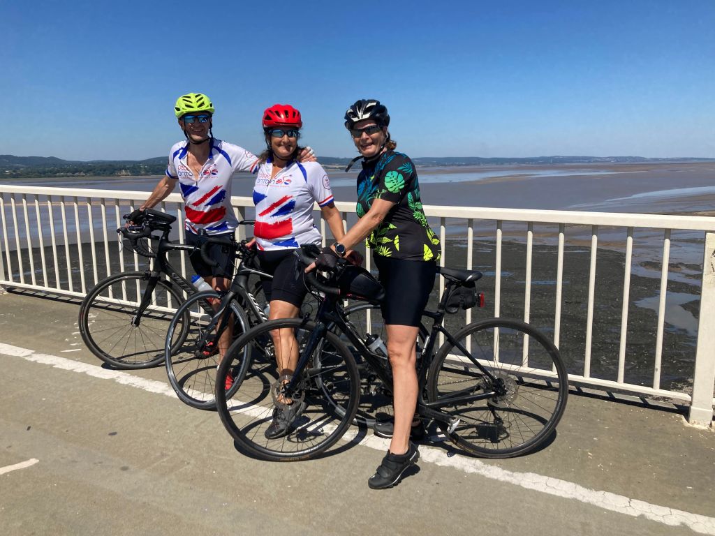 The final leg of our journey today was not entirely straightforward but we focussed on holding the girls train together, not overlapping back wheels whilst staying on the wheel….(Pete, one of our two guides for this trip, had given a very good demonstration of how to ride as a train over dinner earlier in the week, utilising sachets of Ketchup and Brown Sauce!). Mick who was cycling with us as on the ground support, guided us through the last 15k, -including cycle paths (without a ramp onto them) and assorted main road junctions where traffic was busy routing to Chester, Warrington, Manchester or Liverpool and was not always as impressed as it might be to see a train of 5 ladies bikes… until at last we arrived at the hotel. For that Mick had the pleasure of having his photo taken with the girls group. The camaraderie worked really well and we all had a great day “in transition”, in addition to riding at speed as a unit, ably led by Myra this afternoon…who very much enjoyed the experience although she will undoubtedly tell me otherwise over our evening pint!