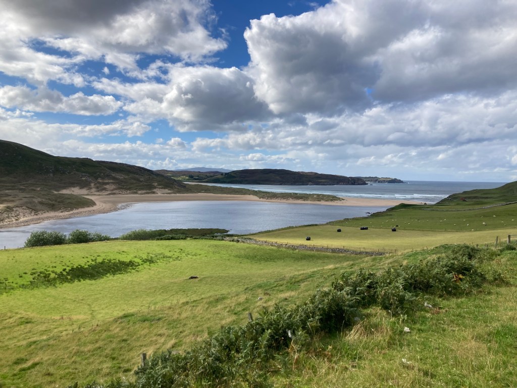 Coming out of lunch (soup roll and sandwiches very much appreciated), the rain descended, very hard. It was time again to don waterproof jackets and go for the descent. From here it was some 32 miles on to Bettyhill, decending via what was often a single track road (with ups and downs of course), through Altnahara & alongside Loch Naver & through a beautiful area known as Strathnaver. As we followed the river, passing through small hamlets and random dwellings, there were fabulous views across the Pentland Firth. Also magically, as we descended the rain cleared and the sun came out, – although still some 18 degrees colder than one week ago!