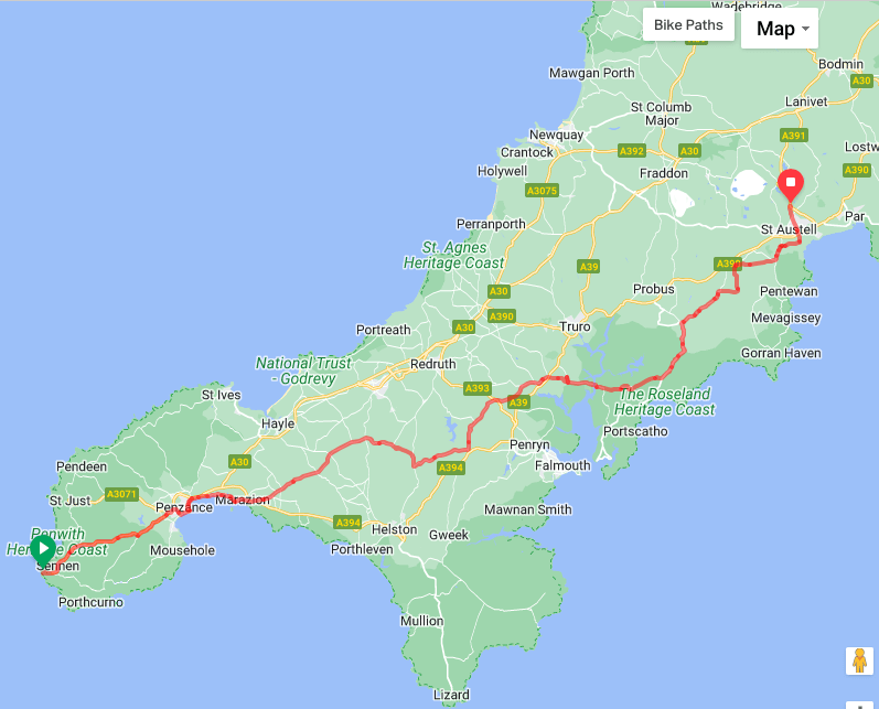 Day one had an amazing start. A taxi to Lands End, then whilst admiring the beautiful scenery and going for the obligatory team photo, I firstly met our brilliantly motivational spin instructor Caroline from the local gym and then heard a “Miss Cornell” , to find one of my A level students and his family staying in the Lands End Hotel. Whilst Caroline was riding the route but with another company, the student concerned was in his words “utterly stunned” to see me and was off to the Scilly Isles with his family. It went both ways Oscar!