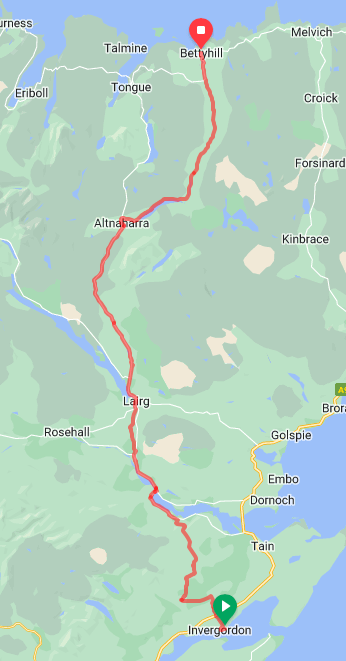 After lunch we headed towards Inverness town centre via road, past the Inverness Caledonian Thistle ground and ultimately across the Kessock bridge via the cycle path on one side. The last time we had crossed this bridge was after completing the North Cast 500 and we were travelling in the opposite direction. Given that this carries the main A9 it is more than extremely busy in terms of traffic and speed. It is also very windy making travelling across just one of those slightly adrenalin fuelled rides, but offering great views both up and down the Beauly Firth. From here it was road and track riding to get to Invergordon. Given that we had now ben riding for 12days, what was noticeable is that base speed had increased significantly and although undulating, we were travelling at 30 kmph, for much of the time into Invergordon. Our accommodation was a pub not far from the waters edge at the far end of town which offered great views up and down the Cromarty Firth. However the best bit of my day was a visit from Jo Adams in the evening. By the time you get to day 12 and are extremely tired, there is nothing nicer than a friendly hug! Jo was also the provider of a very neat little bottle of Highland Park 12 year old, very gratefully received by both Myra and I and consumed post meal and pre bed.