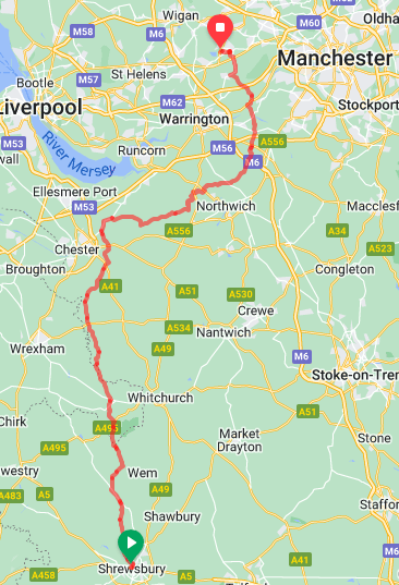 Today was very much a transition day, taking us from the beautiful town of Shrewsbury up to Leigh, neatly skirted the major conurbations en route.