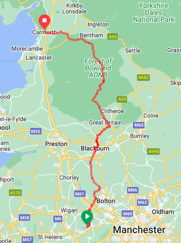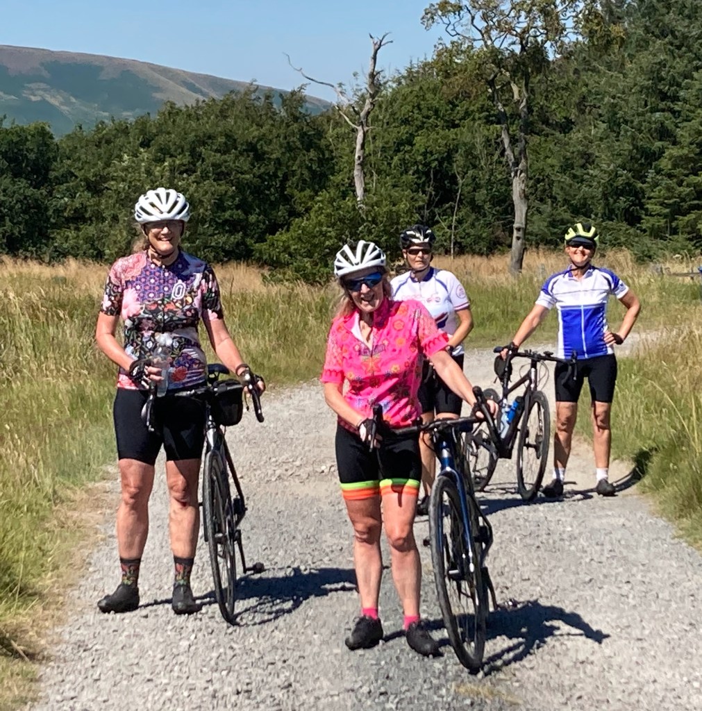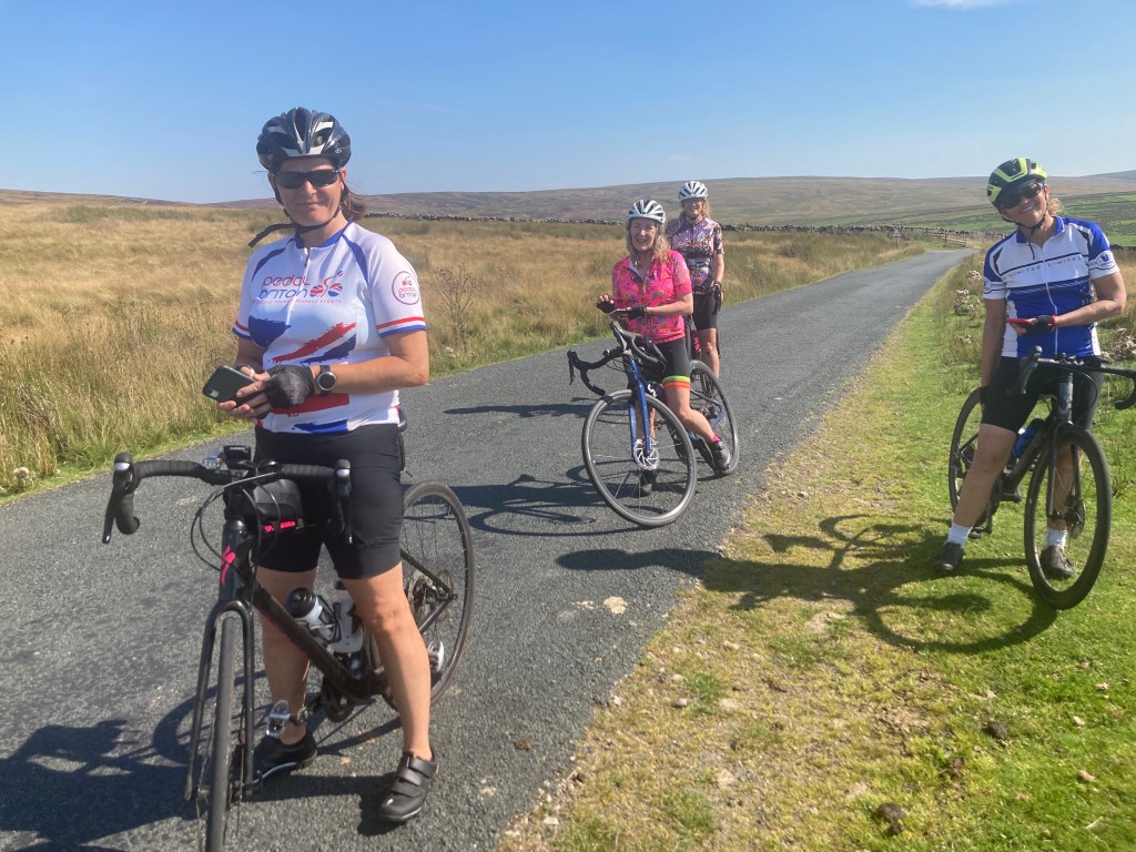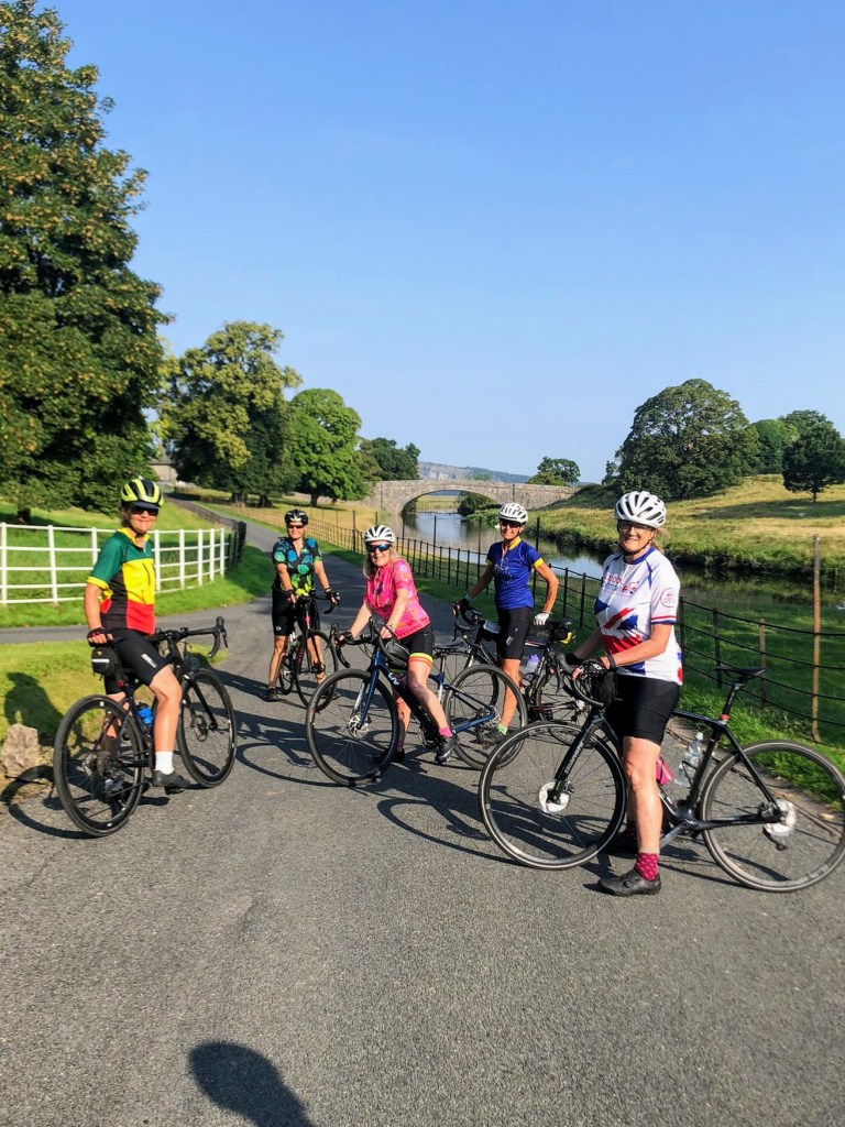 Today was brutal. It was hot, (whoever forecast lower temperatures north of Manchester was utterly wrong), and involved some tough climbs. We started early leaving Leigh after what can only be described as a difficult nights rest. The aircon in our room was not working which had made it difficult to sleep. Having tried the floor (lowest level with cooler air), and given up on that, it was about making the right choices at breakfast to ensure we had enough energy for the day without overloading. So, low GI. Having done the best job we could we set off with a plan to keep the pace low and hopefully experience some cooler air once we got out of the cities. The brilliant August weather ensured the fields glistened and it was impossible not to feel uplifted by the experience of space and colour. We made good progress back in our cycling 5 of yesterday, namely Myra myself, Leonie , Karen and Liz, having a great “brew brake” in the woods, some 26k out, before heading down and through the outskirts of Blackburn on the way back up into the countryside, through the beautiful village of Whalley.