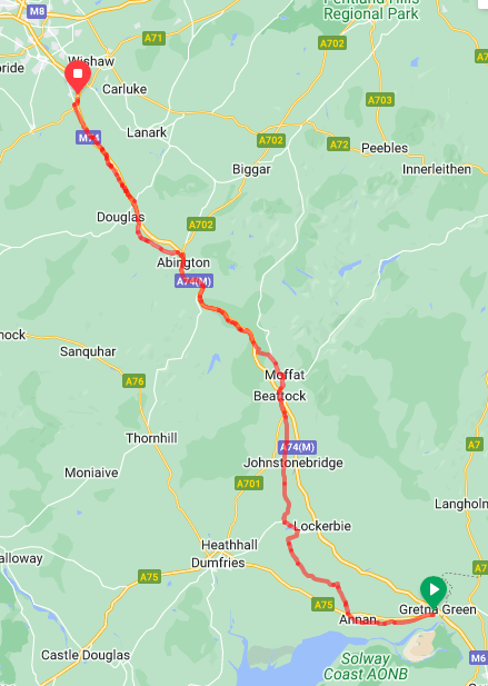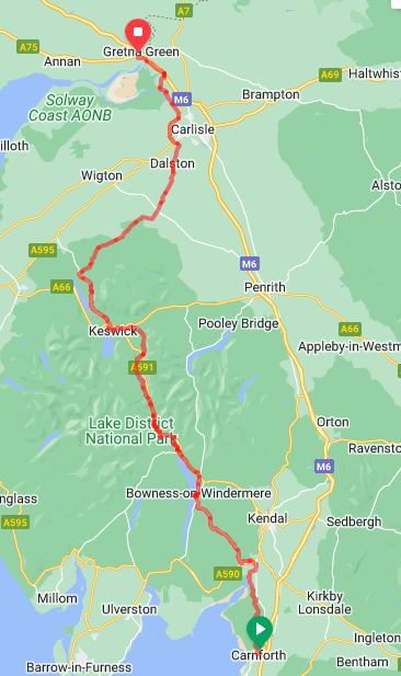 From here it was a steady downhill to Gretna, our final destination for the night. We were tired, very tired, but delighted to have made it so far and in honesty, felt a small sense of celebration as a result. (Code for pint of tenants and pint of cider). We took one last photo as we headed into Scotland which will sign off this post. Tomorrow rain is forecast….. and we have a 77 mile route but less climb. The adventure of climbing up the dual carriageway embankment with our bikes in hand will have to wait…..