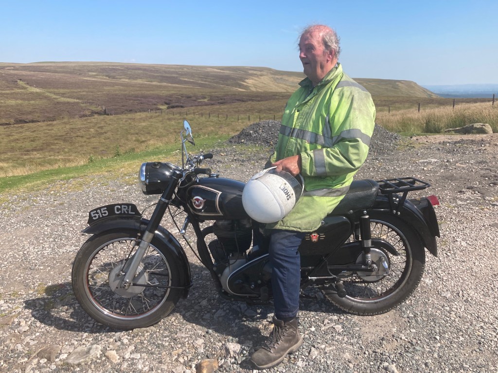 The reminder of the afternoon is now etched permanently in my mind. We spent some time climbing up to the half way point in a valley where the sun was relentless, still within the scope of the Forrest of Bowland (AONB). From there we moved across flat open countryside, peppered with cattlegrids, sheep and cows until reaching a lay-by at the Cross of Greet (@15 miles out of Carnforth) before which we began our descent to our hotel. Whilst having a swift water break here before starting ur descent (it was a running battle to keep hydrated throughout), we were passed by a special motorcycle which then pulled in at the lay-by opposite. The gentleman concerned was riding a Matchless 500, (single cylinder), 1958. A real character, (Ron?) , we had a quick chat and he kindly allowed me to take a photo once I had dutifully admired the bike.