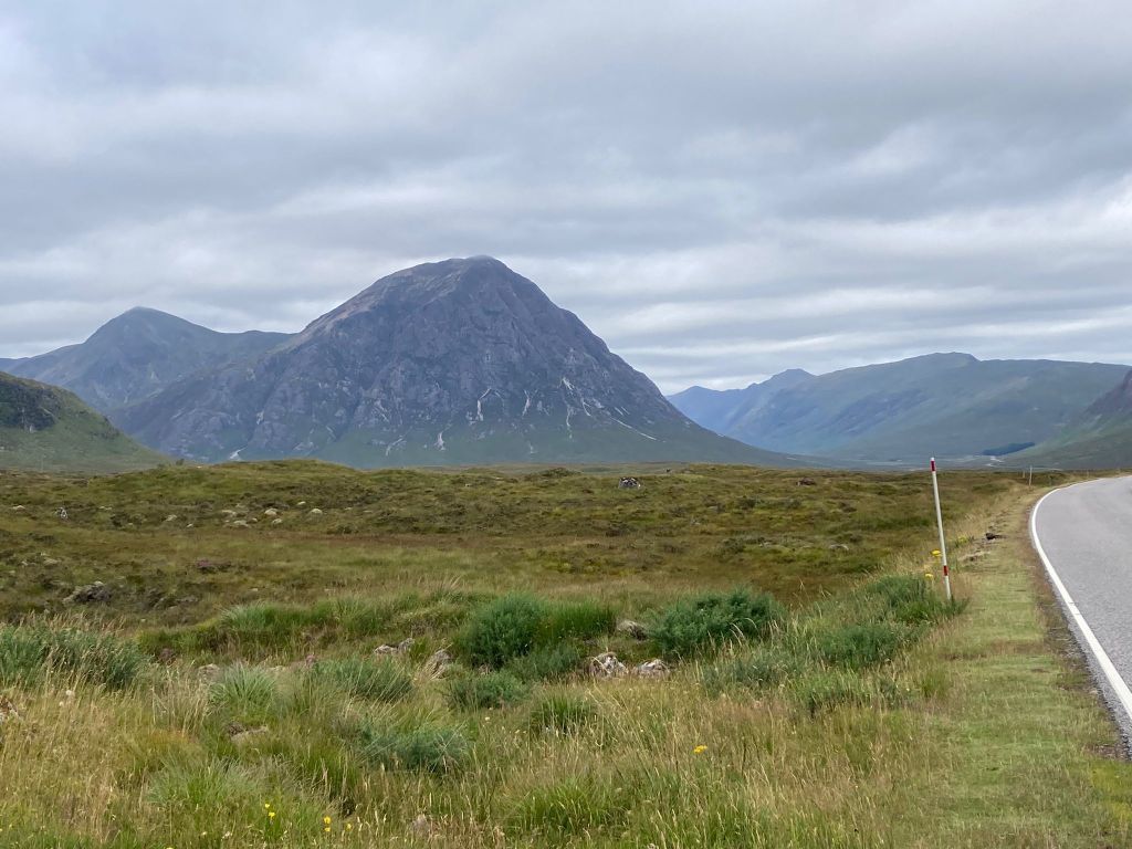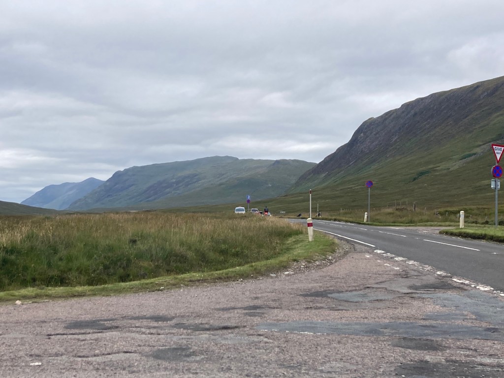 The morning had started as a relatively calm day. However being in the middle of nowhere this was made worse by the wind blowing across the open valleys. as we started to climb Glencoe began to open up in from of us. What an amazing sight. the skies brightened , as did our moods , despite the volume of traffic all keen to come and see such magnificent glacial valleys. For many of us today was to be one of the highlights of the trip, – aside from finishing it! Descending into Glencoe is a single track and on a bike it is possible to gain some real momentum to add to the exhilaration at 49.1 km/ph. Again – our breath was taken away by the views on offer, – so much more to see than in a car…