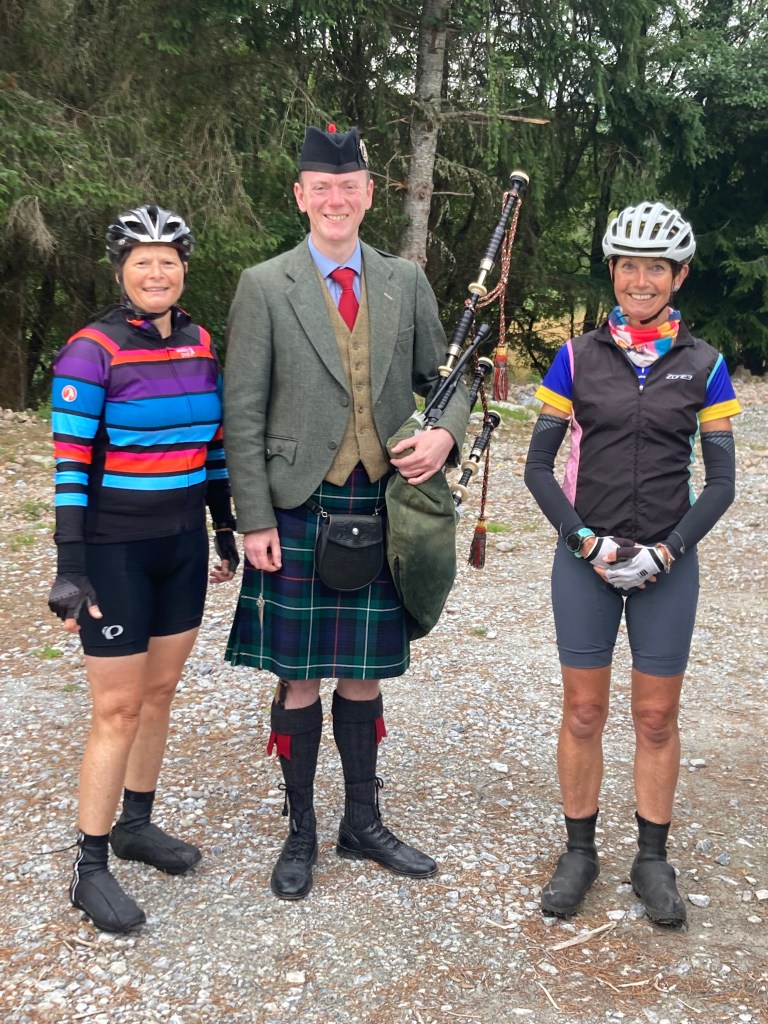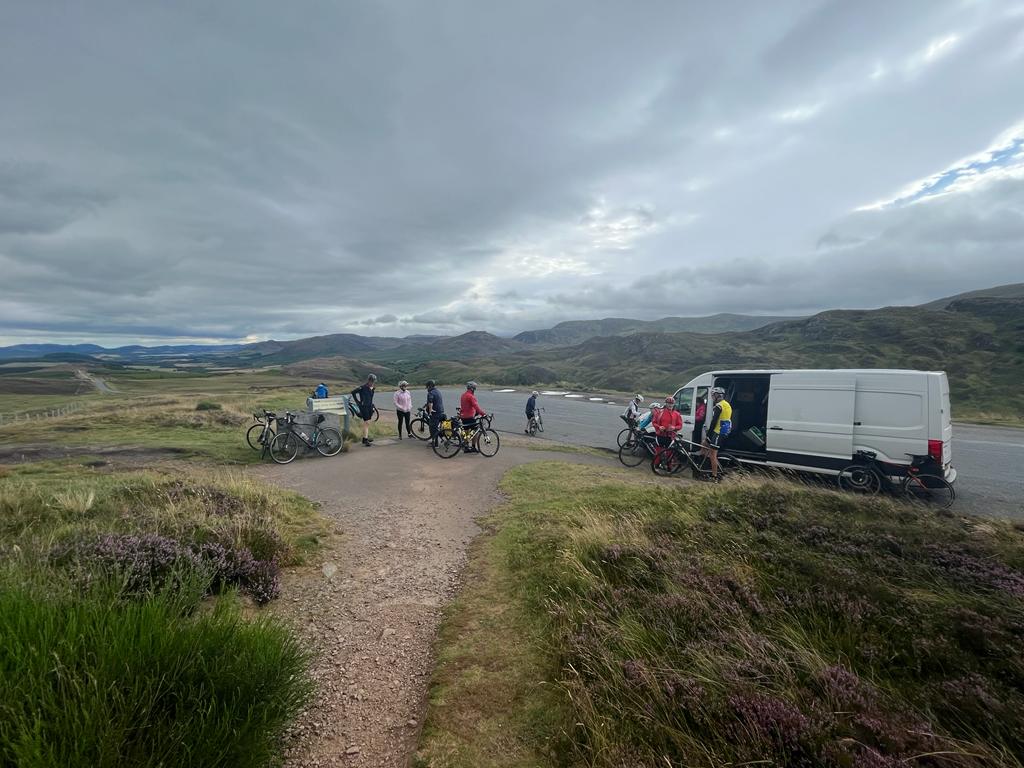 The climb was mad and one of the toughest on the route at some 393m, the summit being Suidhe Viewpoint. We travelled barely 500m before the climb started on the far side of Lochness. Looking at it on Garmin it moved through an interesting spectrum of colour over its 5 mile duration. Red, amber, green red, black (not had one of those before), then red and amber…if nothing else the different colours were at least an indication to gradients. Having. been up this particular hill some 6 years ago I knew what was in store, (although last time we had met a scotsman playing bagpipes at the top and selling tea towels), – this time not so. The clouds were hanging over the loch as we climbed, we also had a group of enthusiastic e-bike riders, (makes for a more inclusive sport so a good thing), giving us motivational call outs on the way up. Without exception everyone got up this one in a much improved capacity than they they would have done if faced with this on day 2 or 3. At the top it was wild and windy but with splendid views over the loch and surrounding countryside.