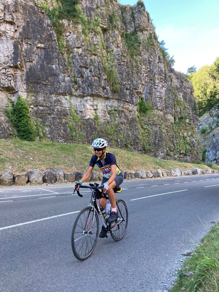 The start of the ride took us up out of Wookey Hole, not anywhere that will feature on my “must return to” list, and wound over towards Cheddar George. Having never been before and not being afraid to stop to preserve my legs and ensure I got to the end of the day most riders including me were keen to stop to admire the view. One of our 2 tour leaders Mick, had placed himself at a mid way point up the George and was capturing photos of each of us as we slowly wound our way up the gorge admiring the rock formations, the goats and flora and fauna.