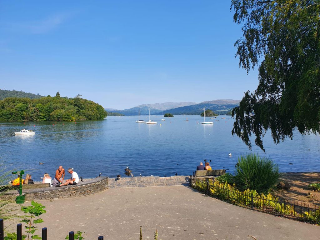 From here we moved out via some very fine bike tracks but then onto the main road, eventually arriving at Windermere on a Sunday in august where we had our morning brew stop, just ahead of moving into the town centre itself. You could tell it ws not going to be easy by the level of fill in the car park. So after taking some sensible nutrition on board we headed out in smaller groups to do careful battle with population. The town centre itself was mobbed, however working as a unit of 5 we did manage to stay upright and avoid both pedestrians and frustrated car drivers. From windermere our route took us via a well thought out balance of cycle routes (populated equally by humans), and main road / country lanes to beautiful Bowness and the heart of the Lake District National Park.