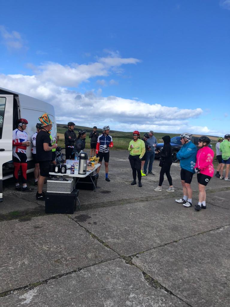 Outside of JOG, we regrouped, waited for those who had got punctures (again), removed our waterproofs and all rode to the finish as a group heading to the legendary mileage marker point. Riding in was exhilarating and who would have guessed there would be much cheering from the tired yet excited to finish humans still on their bikes after over 1000 miles of pedalling. As ever Pete the provider of all things snack wise, provided something better – Prosecco in paper cups. Amazing.