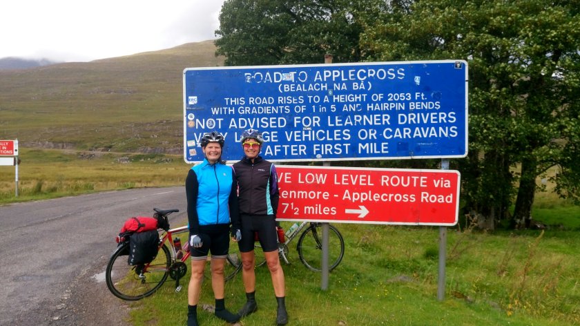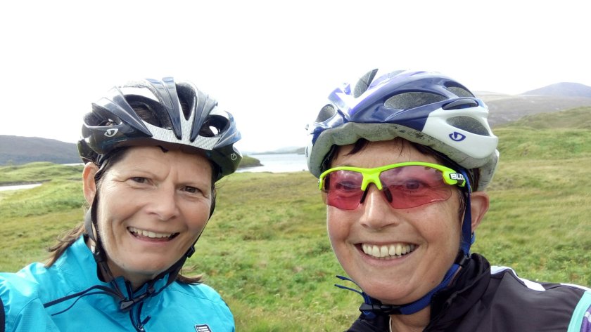 Today is best summarised by views, neoprene and a small tumble. We started off well with a great breakfast in the very fine Artysans café in Inverness. (artysans.org.uk) after which it was time to hit the high road but not before mother nature had thought that having brought kit for all weathers we should try it out! Once we had departed Inverness we found ourselves on the main A862 heading to Beauly. Great views were peeping out at us through an ever lowering cloud base, however the air was markedly cleaner and clearer and we were on our bikes. All was going swimmingly (sometimes almost literally) until we encountered a railway crossing. “Cyclists dismount” I called to Myra, spotting a roadsign. However I made that all too frequent mature decision when you think, “but not us surely”, and having decided railway tracks should be approached when rowing a bow wave ie at 90 degrees, despite the fact that the tracks themselves were at a 45 degree angle to the road, end result a sideways survey of the road surface not just for me, but Myra too, although admittedly at a slightly more sensible pace! Pride, skin and slight body damage ensued, however lunch was calling and 17 miles still waited to be pedalled and there is always ibuprofen! Lunch was a welcome warm up and a small dry out at the Ledgowan Hotel ( with some fine stags on the walls watching us with beady eyes as we dripped into the front door), before heading on towards our destination. Great views opened up during the afternoon on the magnificent road leading to Lochcarron. We arrived at the B&B (Pathend), which boasted rather splendid views of the Loch, just as the clouds cleared. The room was fantastic, our waterproofs which did the best they could against the elements were kindly being dried for us in front if the Aga and an early supper called. Ideally, washed down with a wee local dram ( for medicinal purposes) of course! More later. Picture below best sums up day 1: Shiny (wet), Happy, People.