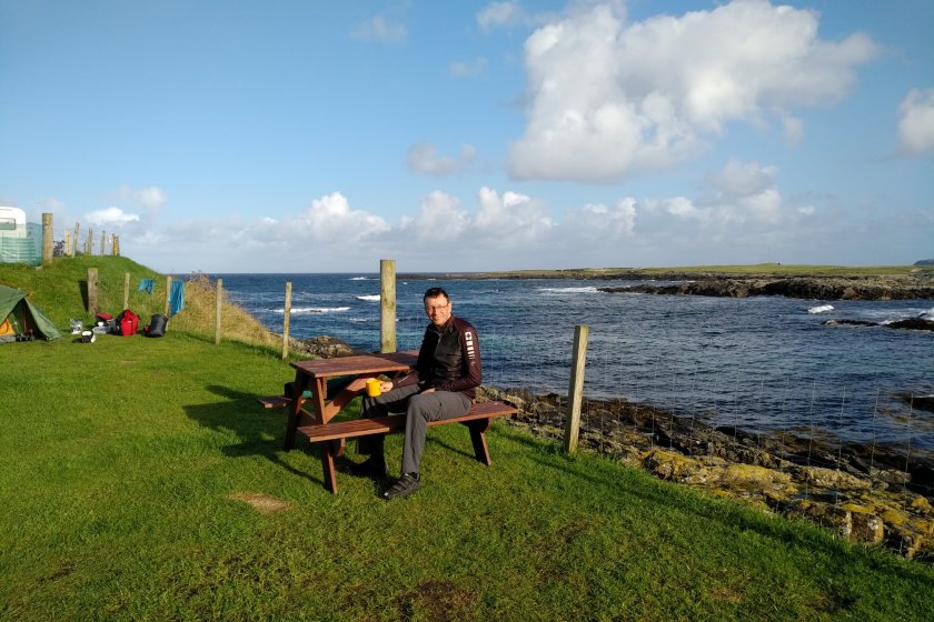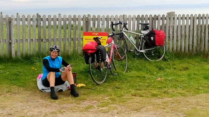 We arrived at John O’Groats to find it was home to a car rally, so we decided to let them get on with it whilst we found ourselves a beautiful sunny spot to have lunch. Infact it got so warm and sunny that for the first time in too many days we risked taking off our neoprene overshoes to allow our bike shoes to dry out! A very relaxing lunch sitting outside people watching and wondering, – all of which there is plenty to do!